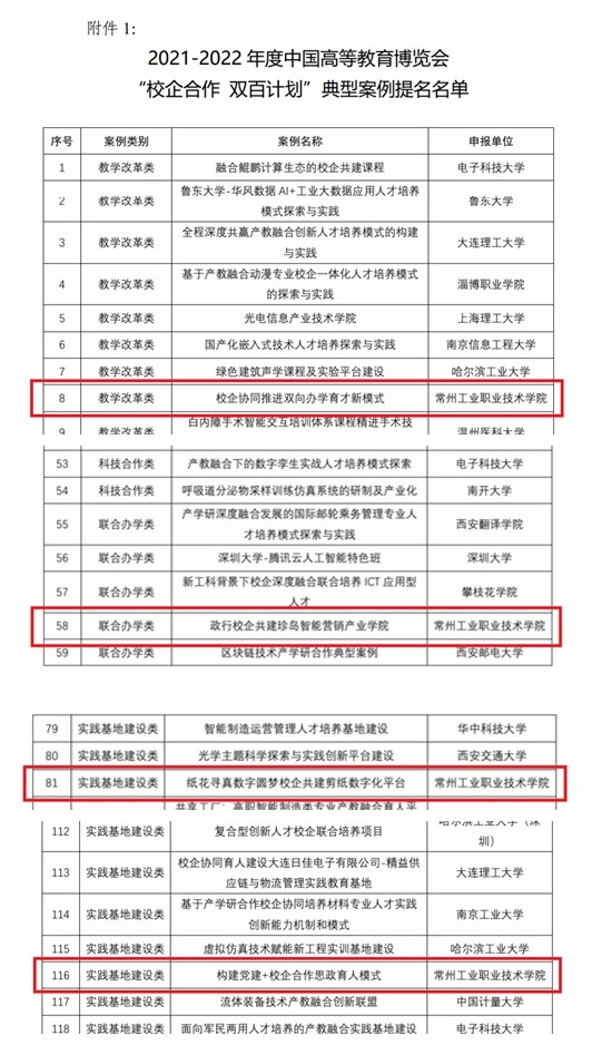 近日,中国高等教育学会公布2021年全国“校企合作 双百计划”典型案例评选结果,常州工业职业技术学院共有4项案例获此提名,位居全国高职院校首位。