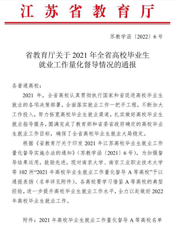 近日,江苏省教育厅就2021年全省高校毕业生就业工作量化督导情况发布通报,常州工程职业技术学院2021年毕业生就业工作获得A等好成绩。