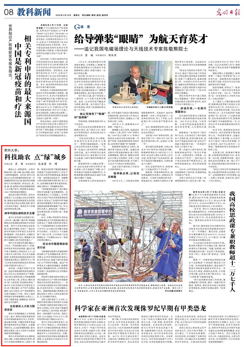 3月18日,光明日报以“科技助农 点‘绿’城乡”为题,围绕跨学科团队提供技术支撑、生态建设人才助力脱贫攻坚、校企合作联盟推进助农行动等方面报道了常州大学生物质资源高质化利用技术的应用成果,中共江苏省委组织部官网同步报道。