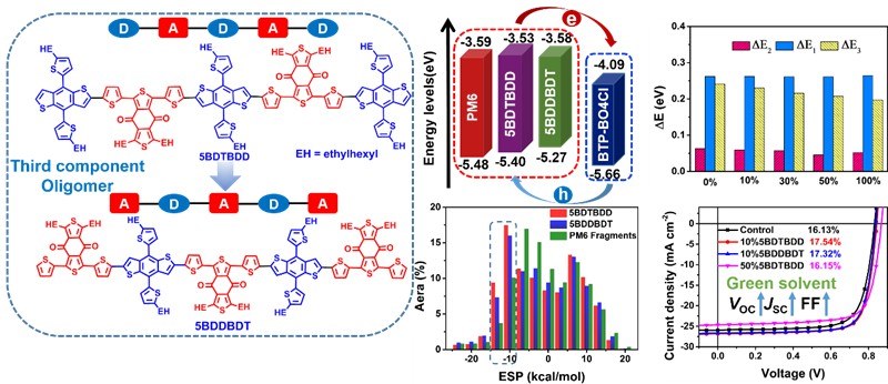 近日,常州大学材料科学与工程学院朱卫国教授团队在有机太阳能电池研究领域又取得了一项重要研究成果,研发的新型供体-受体(D-A)交替型齐聚物材料显示了协同降低能量损失和优化活性层形貌的优异特性。通过绿色溶剂加工,利用该材料实现了三元有机太阳能电池(OSCs)的高效能量转换,器件的能量转换效率(PCE)高达17.54%,该效率是目前非卤溶剂加工有机太阳能电池的最高性能之一。