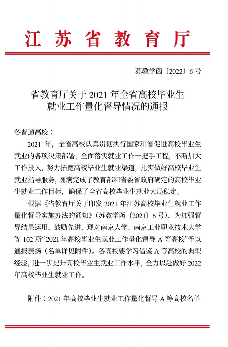 日前,江苏省教育厅发布《省教育厅关于2021年全省高校毕业生就业工作量化督导情况的通报》,对2021年高校毕业生就业工作量化督导A等高校予以通报表扬。常州工业职业技术学院圆满完成既定工作目标,再次荣获就业工作量化考核A等次。