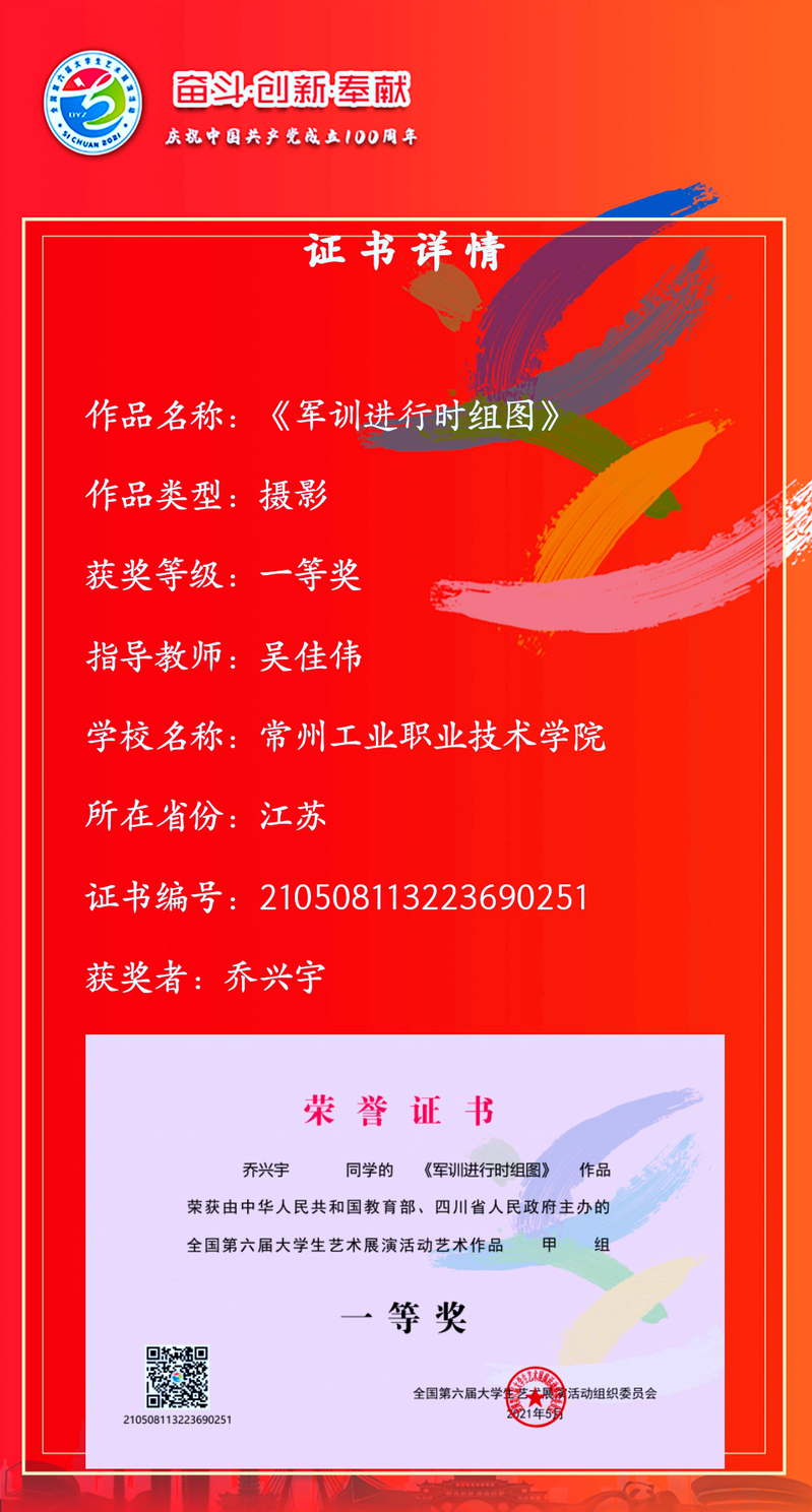 5月12日,由教育部、四川省人民政府共同主办的全国第六届大学生艺术展演活动在成都闭幕。我校学生乔兴宇的摄影作品《军训进行时组图》以省赛特等奖入围本届展演,最终荣获艺术作品类摄影一等奖的优异成绩,实现了我校参加大艺展国赛成绩的历史性突破。