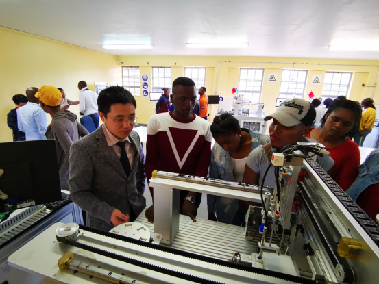 鲁班工坊任教老师裴志坚为南非院校师生介绍机电一体化实训设备
