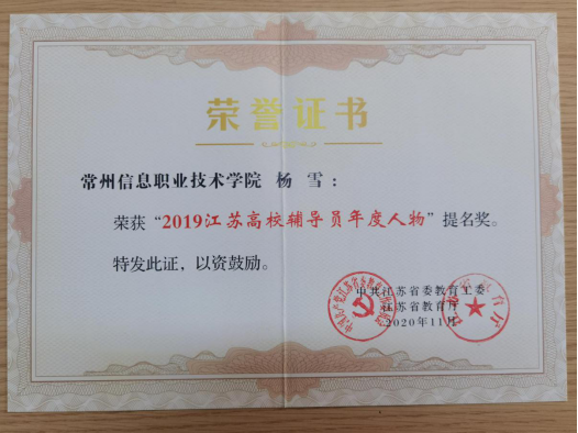 日前,由江苏省教育工委、省教育厅组织的2019年江苏省“高校辅导员年度人物”评选活动结束,通过基层推荐、专家评审等程序,我校辅导员杨雪老师荣获“2019年江苏省高校辅导员年度人物”提名奖。